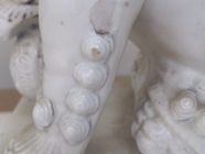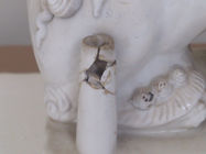 All restorations were reversed and all fragments were thoroughly cleaned. After drying, the sections were assembled using tinted epoxy resin. Areas of loss were filled, and missing elements were reproduced with colour-fills: the same tinted epoxy resin was bulked with fumed silica into a paste. Once fully cured, the colour-fills were polished to a high gloss, imitating the original glazed porcelain. This approach avoids the need to over-spray or paint large glazed areas that are in perfectly good condition. All fills are thus confined to breaks and areas of loss.
