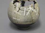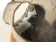 This slipware beaker had been temporarily attached with masking tape which was damaging its fragile slip decoration. After softening the adhesive to remove the tapes, all sections were gently brushed and consolidated where needed. To secure the sections whilst bonding, a low tack tape was used - tested to ensure its safe removal. Fills were made on larger gaps and retouched to a neutral tone.